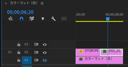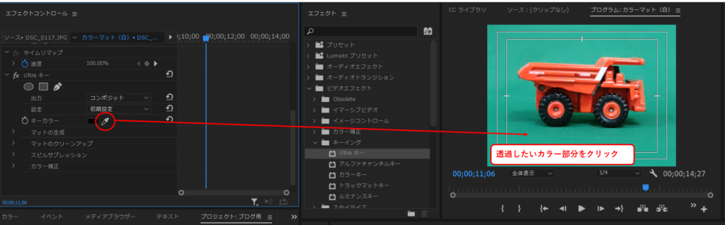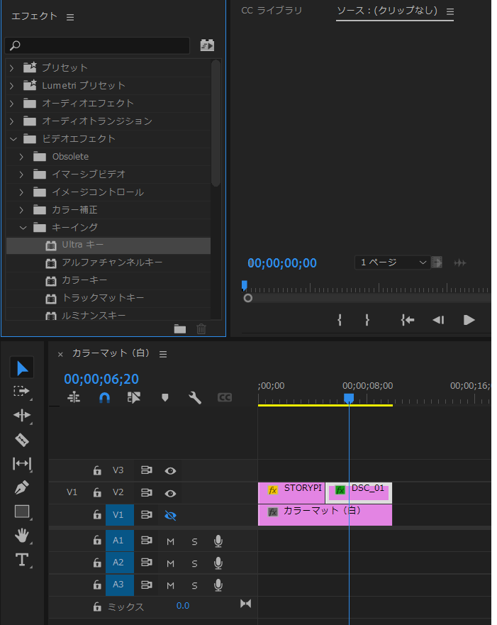 「エフェクト」パネルから「ビデオエフェクト」の「キーイング」からUltraキーをクリックし「タイムライン」パネルの被写体画像にドラッグします。