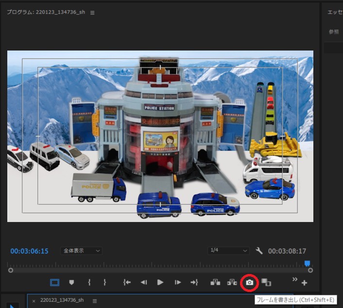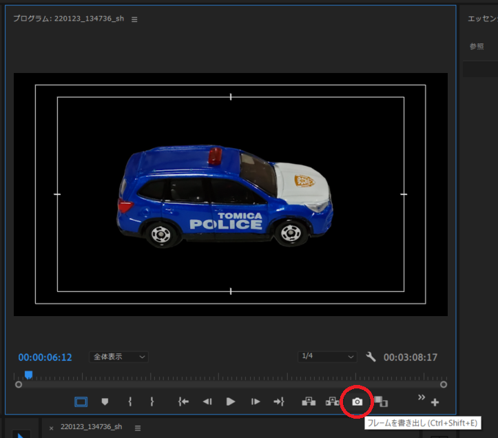 透過画像をPremiereProで作成したらプログラムモニタに表示させ 「フレーム書き出し」(赤丸)をクリックする。