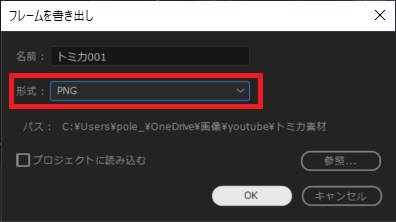 「フレーム書き出し」ウィンドウの「形式」に「PNG」を選択すると透過画像が作成できます。