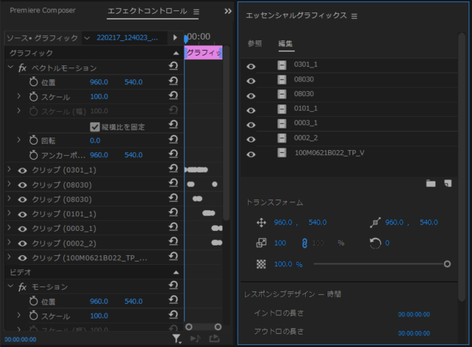 エッセンシャルグラフィックスに素材をまとめた場合は、タイムラインでは1つのグラフィックとなっているのでエッセンシャルグラフィックスとエフェクトコントロールを使って編集作業を行います(図3)。