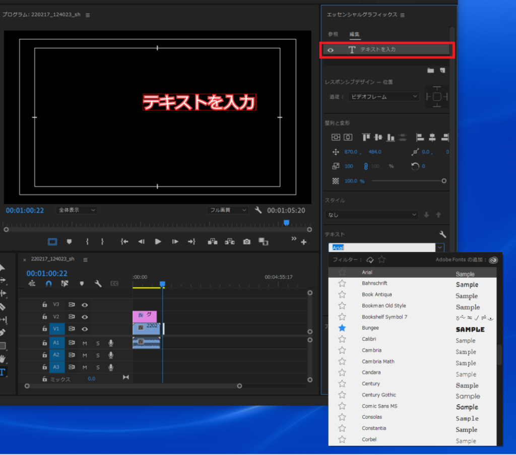 文字の書体(フォント)を指定します。文字をすべて選択(カーソルで選択orエッセンシャルグラフィックスの 「テキストを入力」(図7の赤枠)をダブルクリック)して「テキスト」のフォント選択をします。