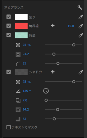 サンプルとして作成したテキストのアビアランスの項目設定内容(図15)とテキストの表示(図16)です。塗り、境界線、背景、シャドウを使っています。今後もいろいろと設定を試してみたいと思います。